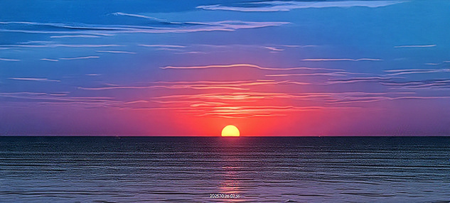 El emperador Sol preside el anfiteatro del horizonte. Primero levanta su pulgar, concediendo un instante de gloria al gladiador rojo que incendia el cielo. Pero pronto, su mirada se endurece: baja el pulgar, y la sentencia es irrevocable. La espada del día atraviesa la arena celeste y el rojo se transmuta en azul, como si la sangre del combate se disolviera en la calma del mar. Así, la aurora se convierte en juicio y metamorfosis, en espectáculo de luz donde cada color lucha, muere y renace bajo la voluntad del astro emperador.