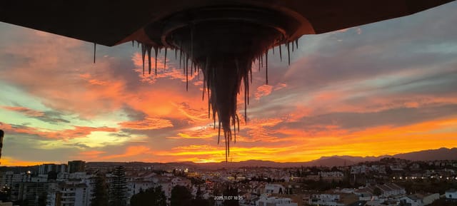 Hace unas semanas contemplé una puesta de sol que tiñó de amarillo brillante el horizonte oeste de Fuengirola. Tomé una foto, pero por alguna razón apareció una mancha en la parte superior; quizá puse un dedo delante del objetivo. Decidí usar una IA para eliminarla, pero, probablemente porque no me expliqué bien, el resultado fue lo que se ve abajo.