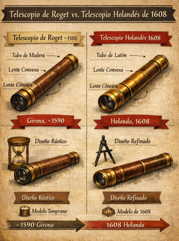 En la imagen de la izquierda, que he creado con ayuda de Copilot, se muestran los parecidos y las diferencias entre el telescopio de Roget de 1590 y el de Holanda en 1608.